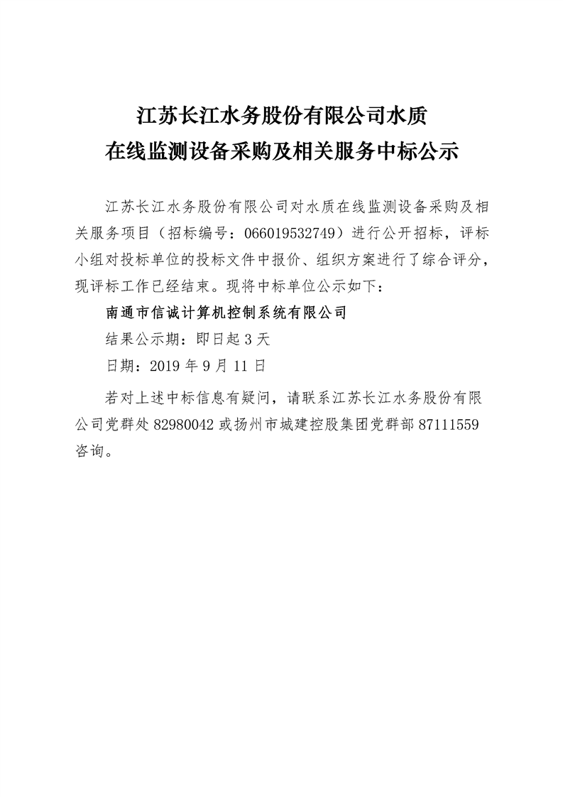 江蘇長江水務(wù)股份有限公司水質(zhì)在線監(jiān)測設(shè)備采購及相關(guān)服務(wù)中標(biāo)公示