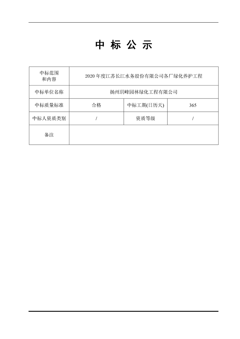 2020年度江蘇長江水務(wù)股份有限公司各廠綠化養(yǎng)護工程中標公示