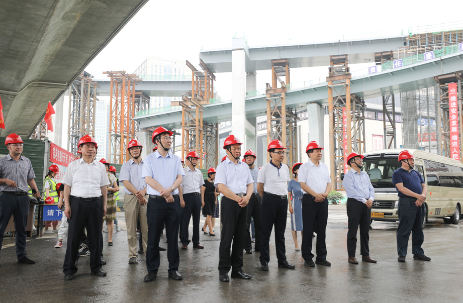 在潤揚路--江陽路互通工程現(xiàn)場,夏心忠副主任介紹了國資委對城控集團在改革發(fā)展方面指導(dǎo)支持的具體做法。葉善祥介紹了城控集團主體信用等級提升工作情況及潤揚路快速化改造(江陽路互通立交)工程項目進度、施工計劃、難點問題。