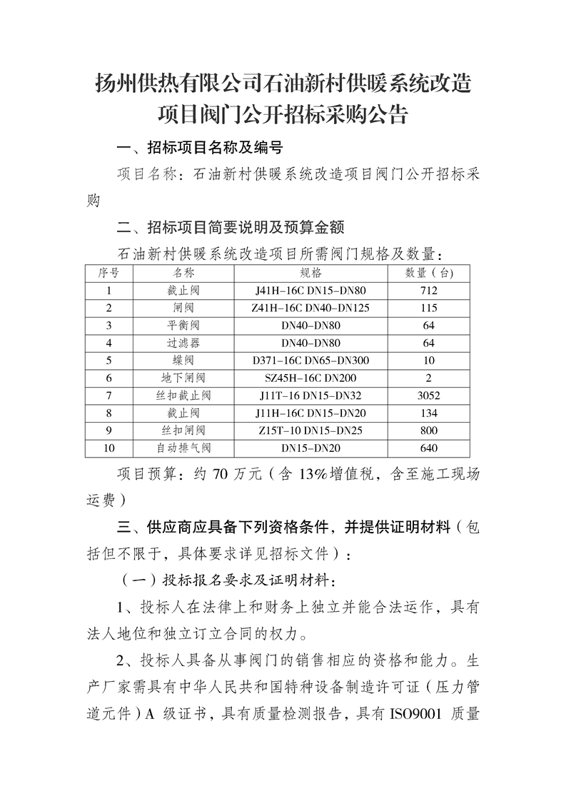 揚州供熱石油新村供暖系統(tǒng)改造閥門招標文件.docx