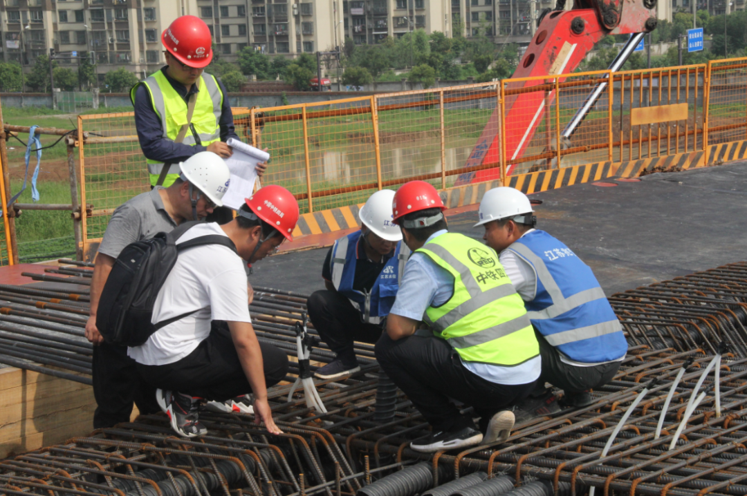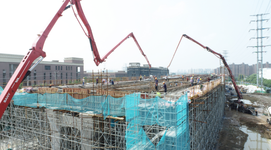 時(shí)值梅雨季節(jié),持續(xù)的降雨天氣給項(xiàng)目施工帶來了諸多不便。為確保人員安全及工程穩(wěn)步推進(jìn),項(xiàng)目部克服了現(xiàn)場10KV和220KV高壓線及梅雨季節(jié)影響,科學(xué)優(yōu)化施工方案、倒排節(jié)點(diǎn)工期、細(xì)化施工計(jì)劃,在做好模板拼裝預(yù)壓、鋼筋綁扎等工作的同時(shí),明確分工、責(zé)任到人,為兩聯(lián)箱梁的順利澆筑提供先決條件。