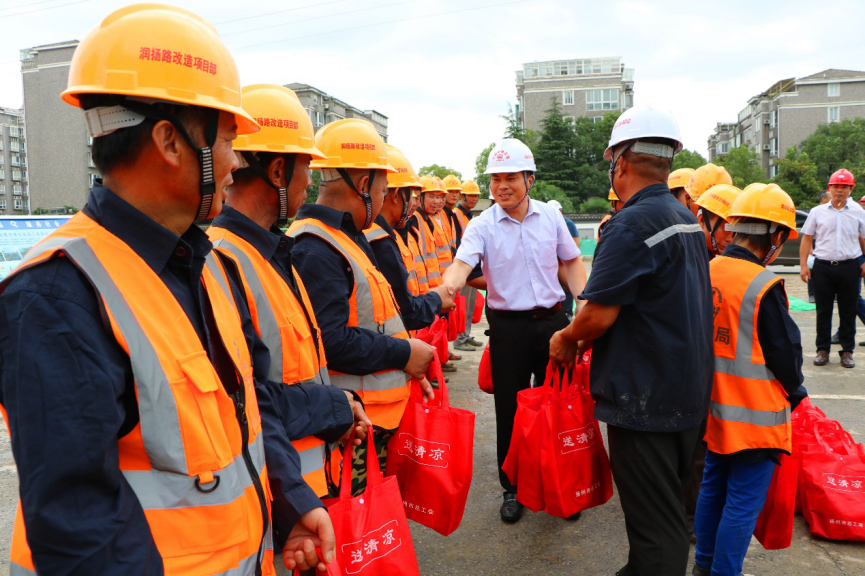 在慰問現(xiàn)場(chǎng),韓士軍一行詳細(xì)了解了潤(rùn)揚(yáng)路快速化改造工程項(xiàng)目建設(shè)進(jìn)展情況,為一線人員發(fā)放了防暑降溫慰問品,叮囑他們高溫作業(yè)一定要在保證工程質(zhì)量和進(jìn)度的同時(shí)加強(qiáng)安全生產(chǎn)。他要求施工單位合理安排作業(yè)時(shí)間,嚴(yán)格落實(shí)現(xiàn)場(chǎng)保護(hù)措施,切實(shí)做好防暑降溫工作,時(shí)刻把人員健康和安全生產(chǎn)放在第一位,有條不紊推進(jìn)各階段目標(biāo)任務(wù)。