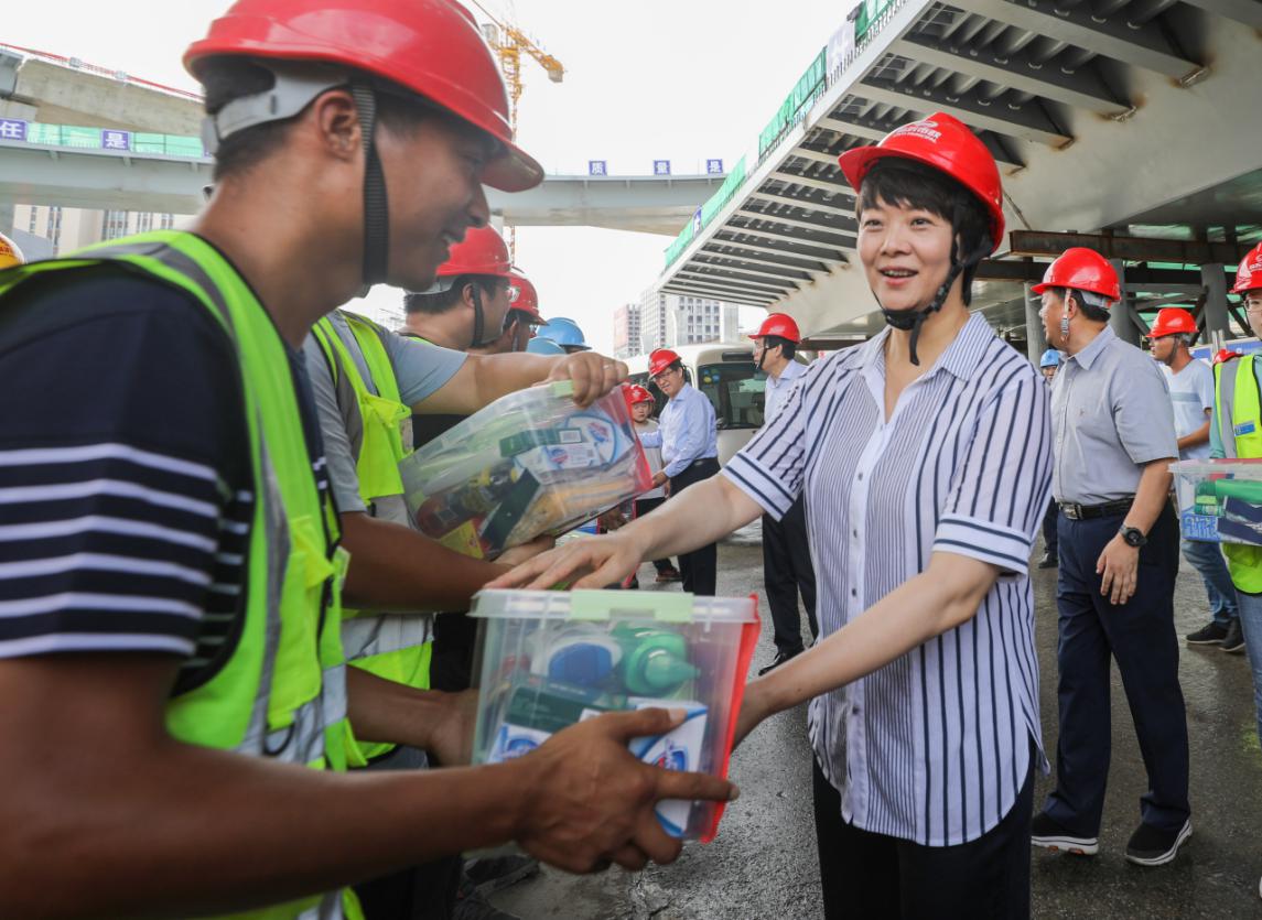 張寶娟一行實(shí)地察看了國泰創(chuàng)新中心、潤(rùn)揚(yáng)快速路、長(zhǎng)江水務(wù)和揚(yáng)州古城保護(hù)成果展示館,詳細(xì)了解項(xiàng)目建設(shè)情況。在潤(rùn)揚(yáng)路快速化改造工程江陽路互通立交施工現(xiàn)場(chǎng),張寶娟給一線的工人們送上防暑物品。她囑咐企業(yè)負(fù)責(zé)人,高溫下連續(xù)工作非常辛苦,要確保高溫天氣作業(yè)安全和工程質(zhì)量,科學(xué)合理安排工時(shí),做好防暑降溫工作,確保如期完成工程建設(shè),早日惠及揚(yáng)州人民。