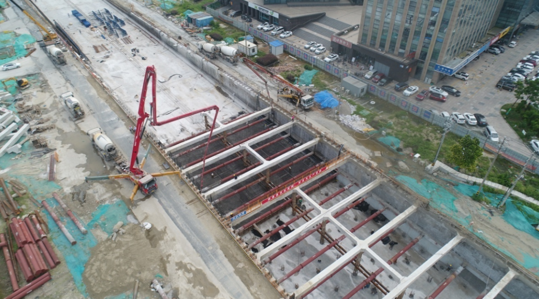 8月21日23:10,經(jīng)過近10小時的連續(xù)作業(yè),運河南北路文昌路隧道首塊大體積混凝土底板澆筑完成,共計澆筑混凝土833.28方。