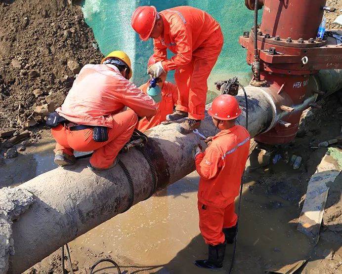 在不間斷施工的10小時過程中,先后完成管道斷管、焊接、新舊管道碰接,恢復新管道供氣全過程施工,確保了棲月苑小區(qū)、潤揚中學和清華園小區(qū)的晚餐正常用氣。