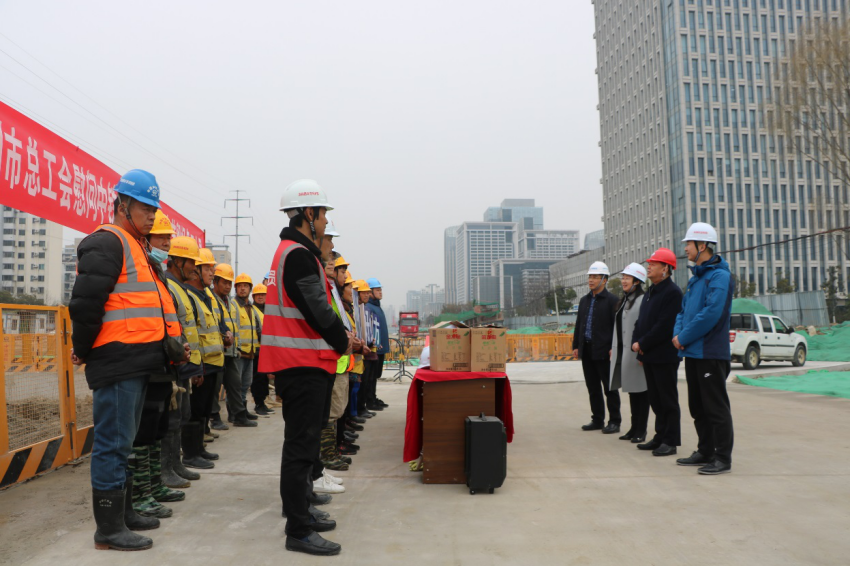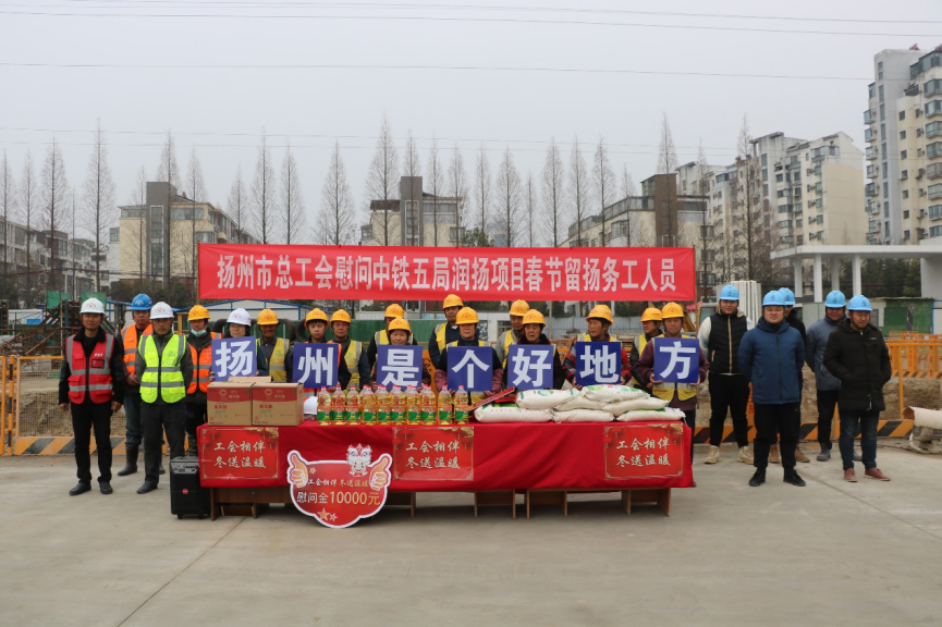 2月5日下午,揚州市總工會副主席洪慧娟一行來到潤揚路快速化改造工程施工現(xiàn)場,看望慰問春節(jié)留揚務工人員。