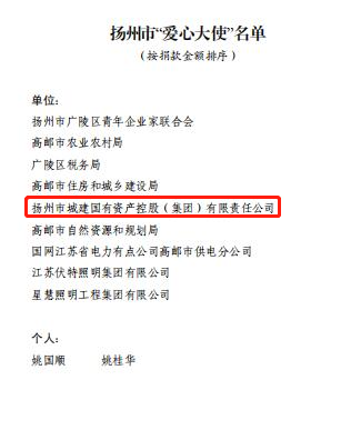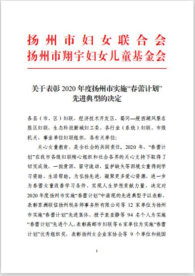 近日,揚(yáng)州市婦聯(lián)發(fā)布《關(guān)于表彰2020年度揚(yáng)州市實(shí)施“春蕾計(jì)劃”先進(jìn)典型的決定》。城控集團(tuán)被表彰為“愛心大使”榮譽(yù)稱號(hào)。