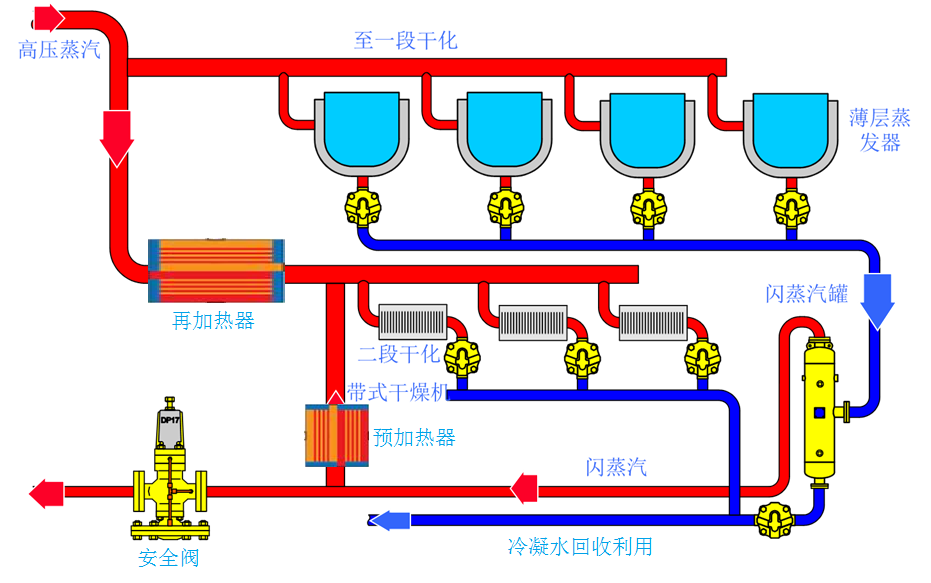 來(lái)自薄層蒸發(fā)器的疏水閥排出的高溫、高壓冷凝水全部進(jìn)入閃蒸罐進(jìn)行閃蒸分離,產(chǎn)生的閃蒸蒸汽進(jìn)入預(yù)加熱器,預(yù)加熱器對(duì)帶式干燥機(jī)內(nèi)循環(huán)空氣進(jìn)行加熱,當(dāng)溫度不能滿足生產(chǎn)要求時(shí),開(kāi)啟再加熱器對(duì)循環(huán)空氣進(jìn)行再次加熱。閃蒸罐分離后的冷凝水通過(guò)底部疏水閥與預(yù)加熱器排出的冷凝水匯合后排入現(xiàn)有蒸汽冷凝水箱。閃蒸罐上設(shè)置安全閥,當(dāng)系統(tǒng)異常,安全閥打開(kāi)泄壓。