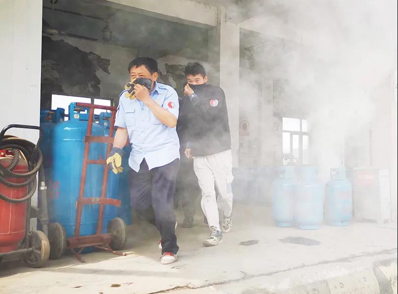 當天下午,隨著一聲哨響,演練正式開始。只見充裝臺上煙霧彌漫,這是用發(fā)煙罐,模擬灌裝秤的皮軟管爆裂脫落,導致液化氣大量泄漏的情景。險情就是命令,灌裝班長迅速指揮灌裝人員以衣物遮擋口鼻,快速撤離現(xiàn)場,避免人員出現(xiàn)窒息與凍傷。警戒組在門口拉起了警戒線,所有無關人員全部撤到警戒線之外,并嚴禁外來人員進入現(xiàn)場。根據(jù)預案,搶修組人員手持銅制不發(fā)火工具組,沖上充裝臺,第一時間切斷灌裝秤后快開閥,避免液化氣繼續(xù)外泄,打開防爆電扇與防爆排風扇,迅速將液化氣濃度降低,隨后對相關皮軟管進行更換,經(jīng)過氣體檢漏儀測試后,確定無泄漏。