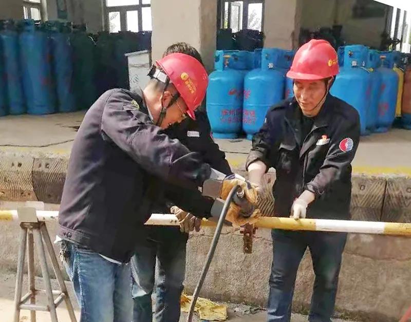 演練現(xiàn)場,通過用氮氣鋼瓶給相關管道加壓,模擬液化氣管道發(fā)生泄漏。只見法蘭連接處滋滋作響,帶壓堵漏組人員攜帶工具迅速趕到現(xiàn)場,在使用專用夾具固定住法蘭后,對其加注填料。經(jīng)氣體檢漏儀測試,管道法蘭處于安全狀態(tài)。