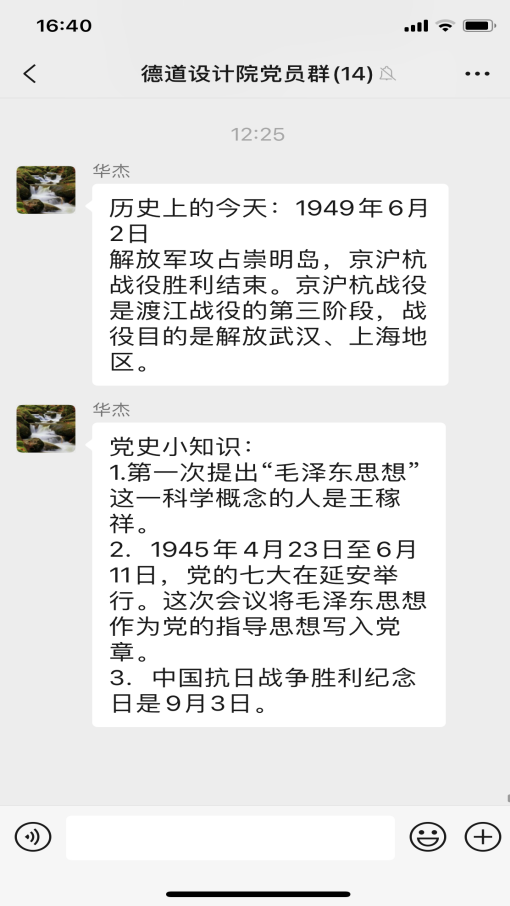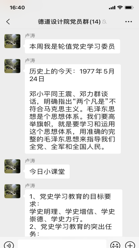近日,為提升學(xué)史學(xué)習(xí)教育的實(shí)效性,設(shè)計(jì)院支部創(chuàng)新思路,結(jié)合工作的特殊性,以“黨員學(xué)習(xí)群”為載體,開展“輪值學(xué)習(xí)委員領(lǐng)學(xué)”活動(dòng),排出學(xué)習(xí)委員輪值表,支部委員帶頭,黨員跟上,每周由一名“學(xué)習(xí)委員”,帶領(lǐng)大家開展黨史線上學(xué)習(xí)。輪值學(xué)習(xí)委員在值班日當(dāng)天利用中午時(shí)間,通過(guò)微信群,“敲黑板、劃重點(diǎn)”,發(fā)布“歷史上的今天”和“今日小課堂”兩個(gè)版塊的學(xué)習(xí)內(nèi)容?!皻v史上的今天”展示了中國(guó)共產(chǎn)黨和新中國(guó)成立以來(lái)重大事件。“今日小課堂”每日推送三條黨史學(xué)習(xí)教育內(nèi)容,讓支部每個(gè)黨員在靈活時(shí)間內(nèi)完成學(xué)習(xí),汲取知識(shí)。