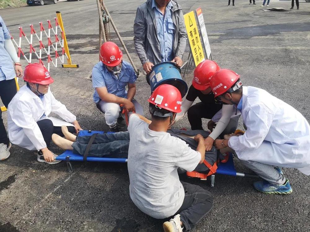 在一陣緊急呼救聲中,應(yīng)急救援演練拉開序幕:現(xiàn)場(chǎng)模擬了施工人員在進(jìn)行井下清淤工作時(shí),由于設(shè)備內(nèi)含氧量不足,發(fā)生了窒息事故,隨即出現(xiàn)頭暈、昏迷情況,情況十分危急!施工安全員發(fā)現(xiàn)情況后,立即上報(bào)指揮長(zhǎng),請(qǐng)求相關(guān)部門協(xié)同應(yīng)急救援。安全員立即對(duì)施工井內(nèi)有毒有害氣體進(jìn)行檢測(cè),符合下井作業(yè)標(biāo)準(zhǔn);救援人員迅速佩戴氧氣罐,按指令下井搜救;醫(yī)療救護(hù)人員備齊擔(dān)架、氧氣袋、止血包扎等醫(yī)療物質(zhì),準(zhǔn)備第一時(shí)間搶救傷員。經(jīng)現(xiàn)場(chǎng)緊急封鎖、傷員移交醫(yī)院、施工人員清點(diǎn)、設(shè)備物資檢查等步驟,事件得到了有效處置,演練總指揮宣布此次“有限空間作業(yè)突發(fā)事件”應(yīng)急救援演練任務(wù)圓滿完成。