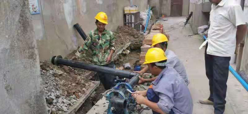 為快速解決學(xué)校用水難題,搶維修中心立刻安排“水網(wǎng)先鋒突擊隊”技術(shù)人員現(xiàn)場查勘,擬定了兩套管網(wǎng)調(diào)整方案:一是從江都南路上DN500主管線接水,由于路線長,費用相對較高;二是從城東路DN200主管線接水,費用相對較低,但是管線走位相對復(fù)雜,且靠近居民院墻和車庫,施工過程中容易引發(fā)矛盾。結(jié)合實際情況,本著盡量降低學(xué)校改造費用的原則,“水網(wǎng)先鋒突擊隊”與德道設(shè)計院多次到現(xiàn)場查勘,與校方密切溝通,決定采取第二種方案。