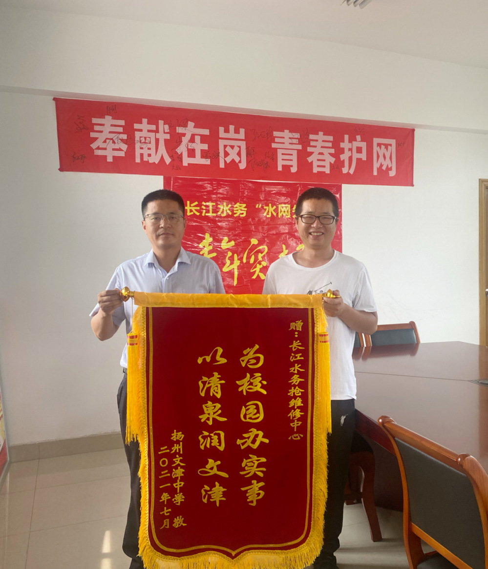 近日,文津中學(xué)為長江水務(wù)搶維修中心送來一面“為校園辦實事,以清泉潤文津”的錦旗,對長江水務(wù)“水網(wǎng)先鋒突擊隊”優(yōu)質(zhì)高效解決學(xué)校用水難題表示衷心感謝。