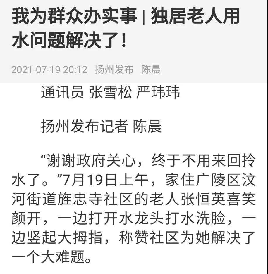 7月19日上午,家住廣陵區(qū)汶河街道旌忠寺社區(qū)的83歲獨居老人張恒英喜笑顏開,一邊打開水龍頭打水洗臉,一邊豎起大拇指,稱贊社區(qū)為她解決了一個大難題。