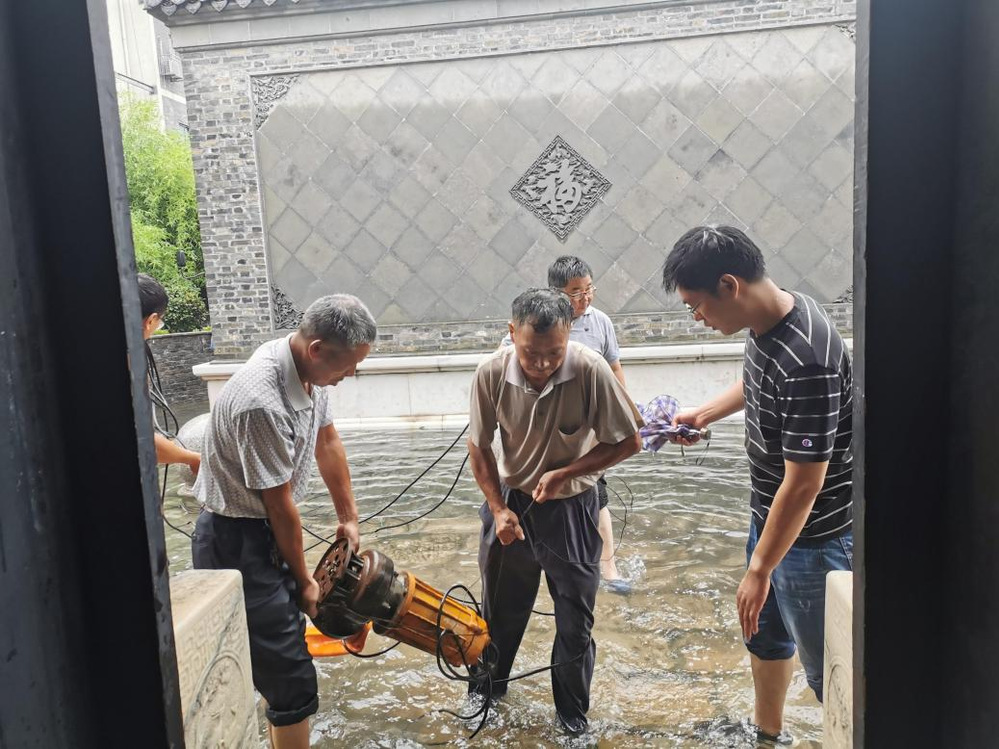 經(jīng)排查發(fā)現(xiàn)緊鄰國家級文物保護(hù)單位汪氏鹽商住宅周邊的南河下、省級文保單位蔚圃南側(cè)的風(fēng)箱巷出現(xiàn)嚴(yán)重積水情況,公司第一時間組織工作人員,攜帶抽水泵等設(shè)備進(jìn)行抽水,最大程度降低暴雨對古宅的影響,確保國有資產(chǎn)的安全。