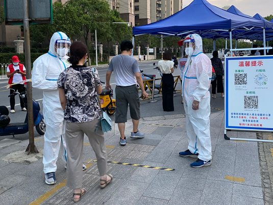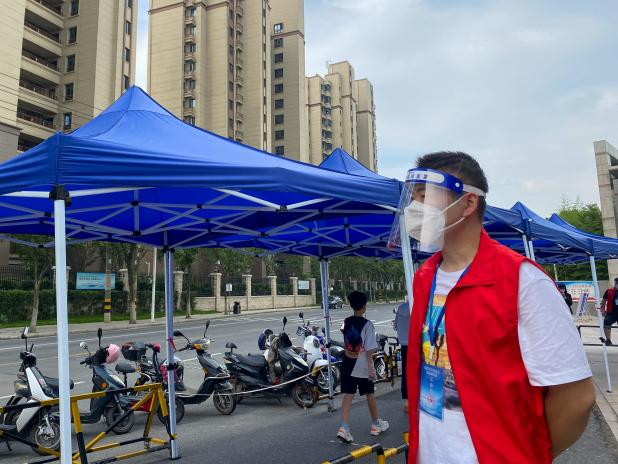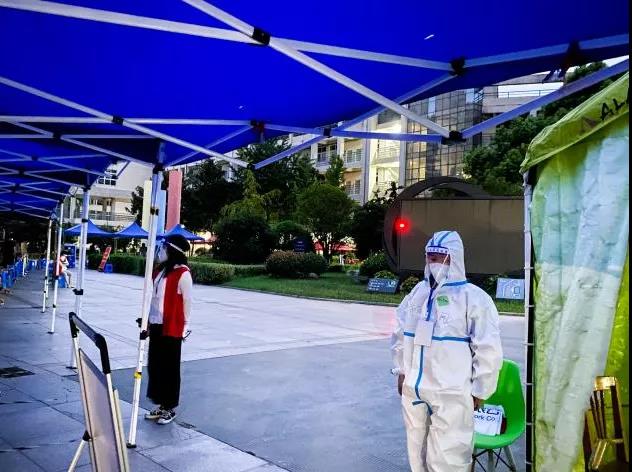 “大家保持一米距離,按照地上貼的標(biāo)識(shí)排隊(duì),核酸采樣很快請(qǐng)大家稍安勿躁!” 在揚(yáng)州東區(qū)附中核酸檢測(cè)點(diǎn),有一群人頂著烈日穿梭在人群中,拿著大喇叭維持秩序,幫助市民完成掃碼注冊(cè),引導(dǎo)群眾有序參檢,他們是來自揚(yáng)州市政管網(wǎng)公司890服務(wù)隊(duì)的志愿者。