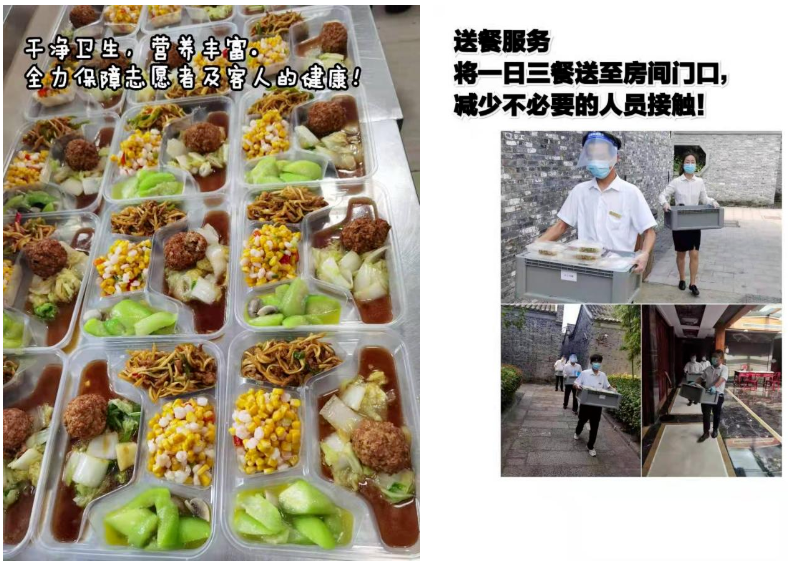 嚴控食品安全管理不越紅線。嚴格把控食品安全關(guān),建議供貨商進行無接觸配送,每日及時清理過期變質(zhì)原料和食品;客人餐食合理搭配,營養(yǎng)均衡,每日將三餐送至客房區(qū)域,由客人自取,用餐完畢由服務(wù)人員取走餐具進行清洗、消毒,垃圾統(tǒng)一回收處理。