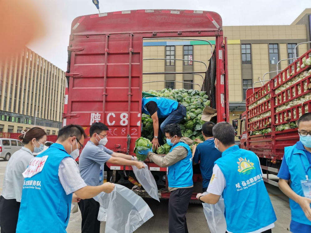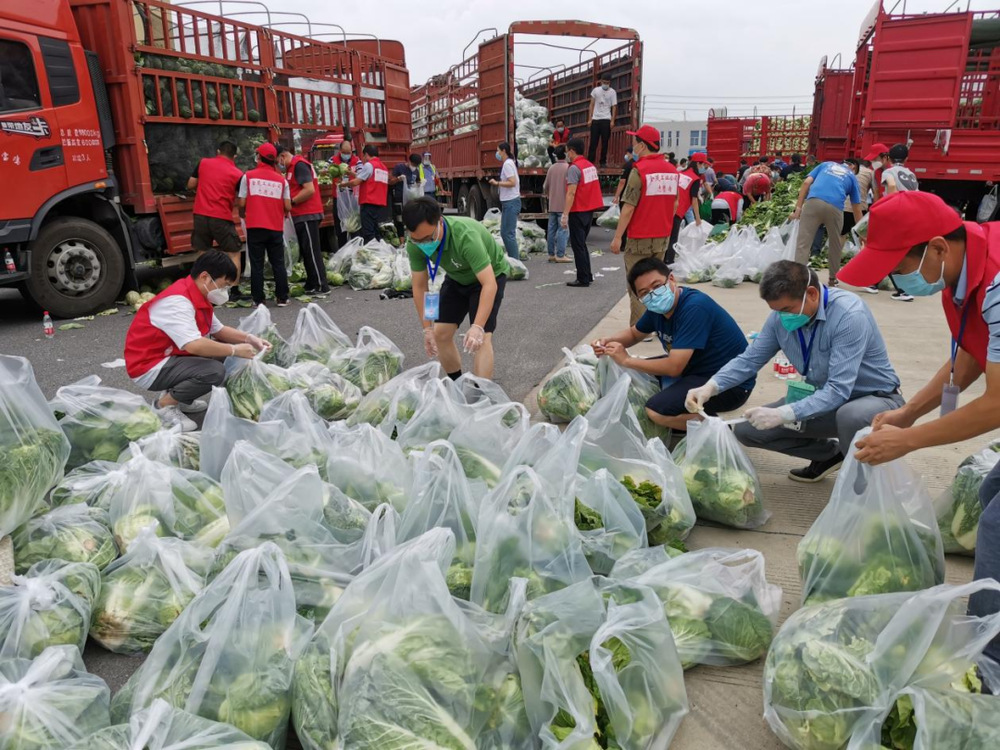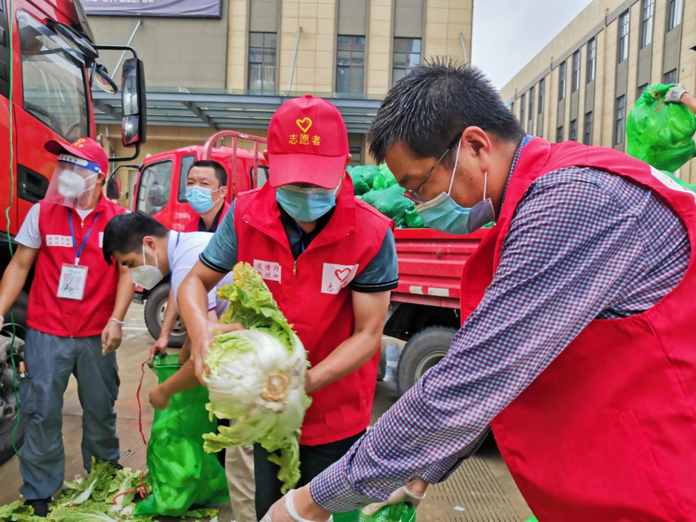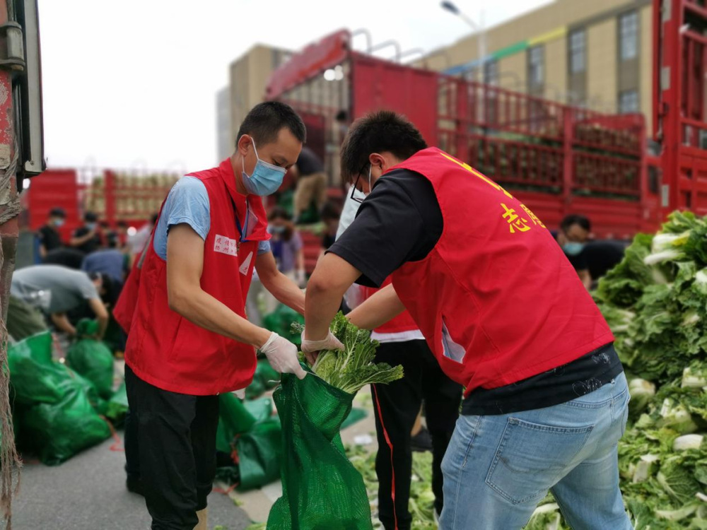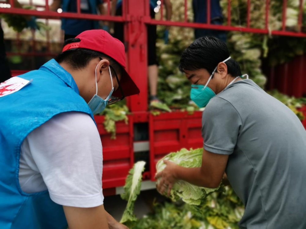 由于蔬菜數(shù)量龐大,為保障居民能夠及時拿到“愛心菜”,13:30,城控集團又從各志愿服務(wù)小組緊急抽調(diào)50名志愿者奔赴萬噸冷鏈進行現(xiàn)場支援。