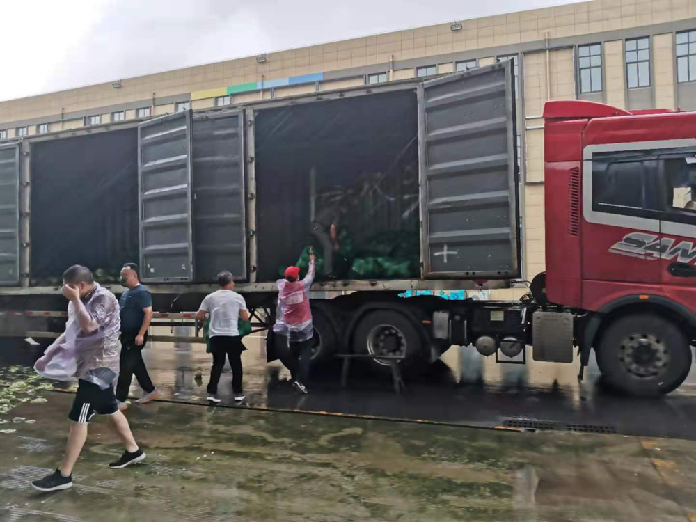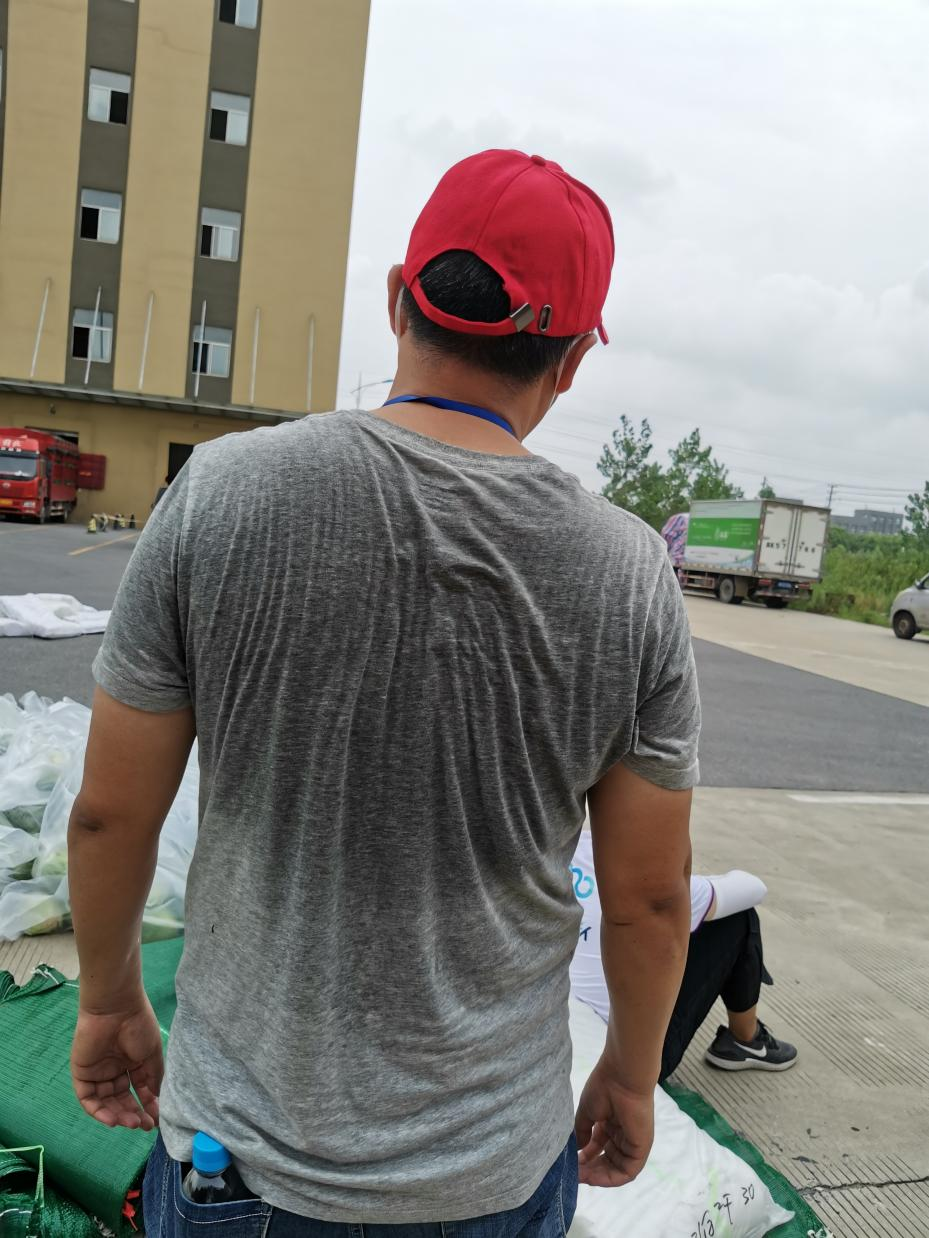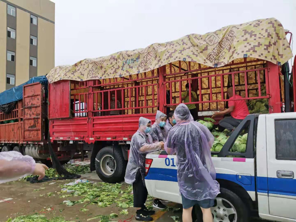 14:30,天空開始飄起雨點,大家依舊堅守在各自的崗位上,很快雨點就打濕了衣服和頭發(fā),可現(xiàn)場沒有一個人退下躲雨。“這車卸得差不多了,我們?nèi)ツ沁厧兔Α保摆踅瓍^(qū)轉(zhuǎn)運蔬菜的車來了,需要10個人裝車”,“我去”“我也去”,現(xiàn)場只有時不時這樣的聲音傳來。