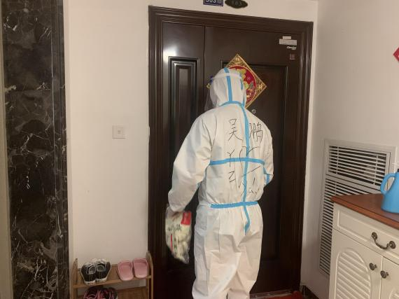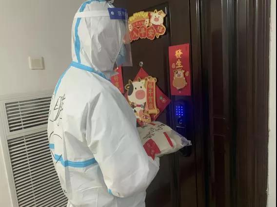 說干就干,大家迅速翻找出此前已經(jīng)整理好的業(yè)主資料和信息,從中挑選出空巢老人住戶和封閉隔離住戶,然后換上防護(hù)服,推上小推車,前往各樓棟,進(jìn)行分發(fā)。分發(fā)時,還細(xì)心詢問了業(yè)主的口味,盡量滿足大家的喜好。