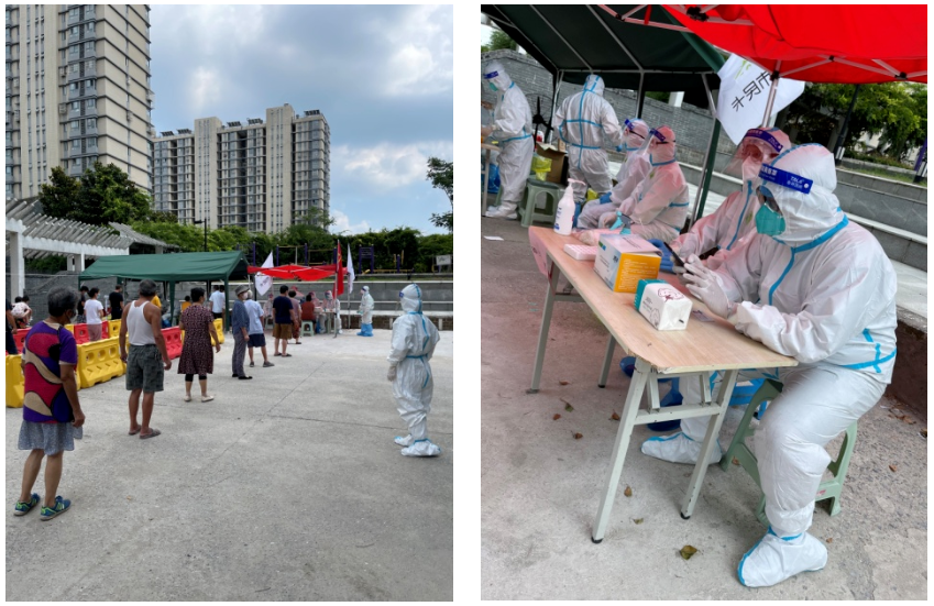 志愿者的臉龐遮掩在面罩與口罩下,身形隱藏于防護(hù)服和藍(lán)馬甲里,面對(duì)炎炎酷暑與疫情防控的雙重“烤”驗(yàn),化身居民“汗”衛(wèi)者,守好社區(qū)“安全線”。8月7日,志愿者服務(wù)隊(duì)接到支援廣?;▓@廣欣苑輔助核酸檢測(cè)、協(xié)助物資采購(gòu)的任務(wù)。自此后的10天中,他們輔助該封閉小區(qū)開展核酸檢測(cè),做好逐樓通知并維護(hù)核酸檢測(cè)點(diǎn)秩序,至今累計(jì)服務(wù)7次核酸檢測(cè)。他們還協(xié)助社區(qū)完成所轄區(qū)域內(nèi)居民信息核對(duì),值守小區(qū)出入口,嚴(yán)格查驗(yàn)體溫和“兩碼”,并幫助社區(qū)做好居民生活物資的預(yù)訂、采購(gòu)和配送。