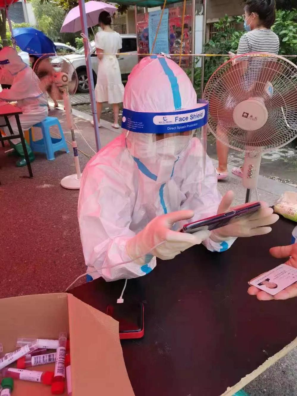 “女兒,我雖然已經(jīng)五十幾歲了,但是我還能出一份力的!”穿上紅馬甲的葛德林很自信。“爸爸,一位年過半百的人都能有這么高的覺悟,作為年輕人的我也不能掉隊(duì)呀!”葛愛婷下定決心要做好志愿服務(wù)工作,葛愛婷是供水服務(wù)大廳的收費(fèi)員,平時(shí)與數(shù)字?jǐn)?shù)據(jù)打交道比較多,于是她成了核酸檢測(cè)數(shù)據(jù)信息采錄人員。她把年紀(jì)尚小的兩個(gè)小孩都丟給家人照顧,在經(jīng)過疫情防控知識(shí)培訓(xùn)后,每天穿上密不透風(fēng)的防護(hù)服,戴上防護(hù)面罩和手套,成了一名“大白”,負(fù)責(zé)核酸檢測(cè)人員信息采樣登記。驗(yàn)碼、掃描、錄入數(shù)據(jù)……每次核酸檢測(cè)時(shí),這樣的勞動(dòng)數(shù)以萬次,每次她都一絲不茍,深怕出現(xiàn)差錯(cuò),影響檢測(cè)結(jié)果。每天工作十幾個(gè)小時(shí),經(jīng)歷高溫酷暑,渾身濕透毫無怨言。