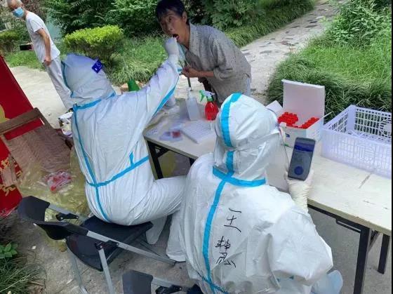 增加了一組檢測(cè)臺(tái),檢測(cè)進(jìn)度果然加快了很多,11:30,當(dāng)天現(xiàn)場(chǎng)的核酸檢測(cè)工作就全部結(jié)束了。完成現(xiàn)場(chǎng)工作后,韓棟也不更換防護(hù)服,不喝點(diǎn)水補(bǔ)充流失的水分了,一鼓作氣,陪同一名醫(yī)護(hù)人員,前往各樓棟為行動(dòng)不便的老人進(jìn)行了采樣。