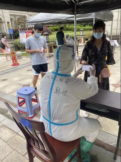 “我來吧!”壯壯的韓棟走上前一步,“我主要是負(fù)責(zé)小區(qū)里行動(dòng)不便的老人,我去支援登記工作,到時(shí)候我們就先完成現(xiàn)場(chǎng)工作,最后上門幫幾位老年人做吧?!甭犃隧n棟的建議,大家紛紛贊同。事不宜遲,登記人員立刻為韓棟做了崗前培訓(xùn),掃描身份證和試管條碼的方法、角度,只有身份證照片的如何操作?只有身份證號(hào)的如何操作?掌握了知識(shí)要領(lǐng)的韓棟立即穿上防護(hù)服化身“韓大白”,正式成為了當(dāng)天核酸檢測(cè)的登記人員。