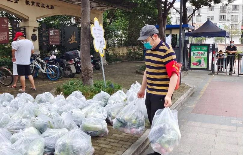 技術(shù)部職工田源為社區(qū)居民派送政府平價(jià)菜。