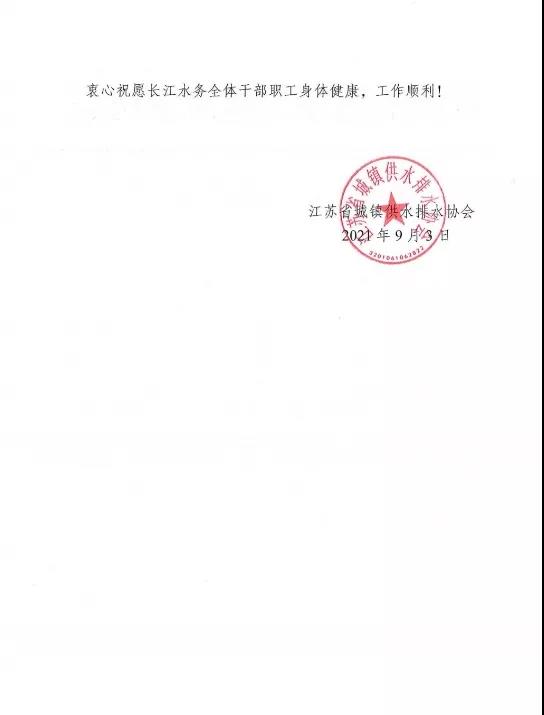9月3日,長(zhǎng)江水務(wù)收到江蘇省城鎮(zhèn)供水排水協(xié)會(huì)發(fā)來的慰問信,慰問信寫道:疫情期間揚(yáng)州自來水充足供應(yīng),水質(zhì)合格,長(zhǎng)江水務(wù)為保障市民生活,為揚(yáng)州打贏疫情阻擊戰(zhàn)貢獻(xiàn)了重要力量,充分體現(xiàn)了民生保供企業(yè)崇高的使命感和強(qiáng)烈的責(zé)任感。省水協(xié)通過慰問信的方式,向持續(xù)奮戰(zhàn)在防疫保供一線的長(zhǎng)江水務(wù)全體干部職工表示最誠(chéng)摯的問候。