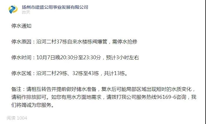 17:15,搶修人員到達現(xiàn)場。經(jīng)現(xiàn)場排查,系沿河二村37棟108室西側(cè)閥門井內(nèi)DN80自來水水管爆管,需停水搶修??紤]到正值用水高峰期,為不影響周圍群眾正常生活用水,公司決定搶修人員原地待命,做好搶修準(zhǔn)備,待用水高峰過后再進行搶修。同時,通過公司微信公眾號等方式發(fā)布停水通知,提醒居民做好儲水準(zhǔn)備。