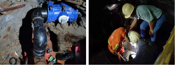 20:30,根據(jù)現(xiàn)場環(huán)境制定搶修方案后,搶修人員以最快的速度完成管道搶修為目標(biāo),克服時間緊、作業(yè)空間狹小等不利因素,正式開始搶修。