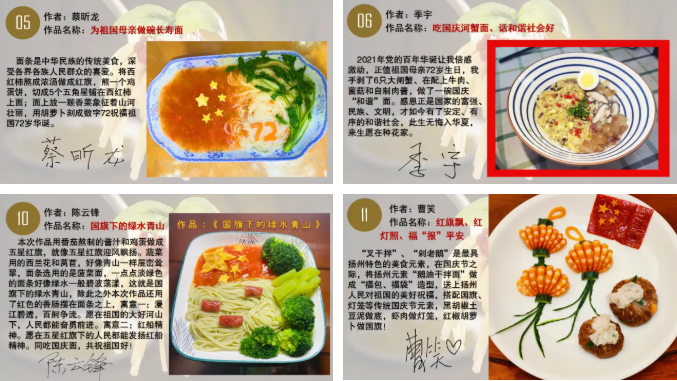 職工以家庭為單位,作品以面條為主,要求自己親手烹飪制作,成果以照片形式展現(xiàn),作者需為自己的作品命名,并附上對菜品特殊寓意的注解和對祖國的美好期愿與祝福。截至活動結(jié)束,共收到14個職工家庭的作品。10月9日,由公司領(lǐng)導(dǎo)班子成員組成的評委小組對作品進行了評審,共評出一二三等獎各1名。