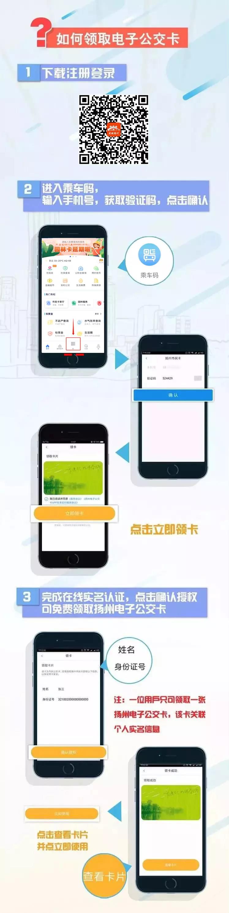 2、下載“我的揚(yáng)州APP”并實(shí)名注冊,領(lǐng)取電子公交卡。步驟如下: