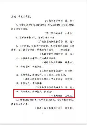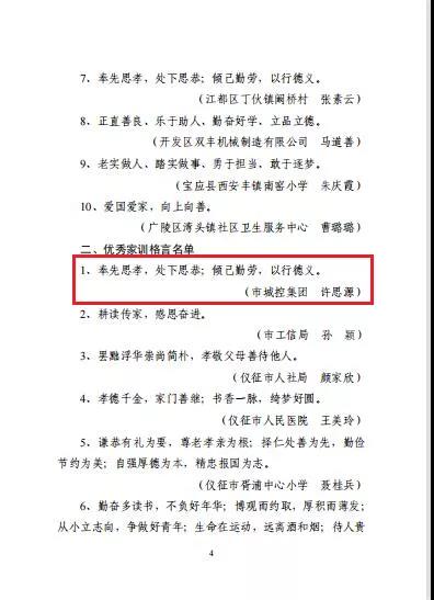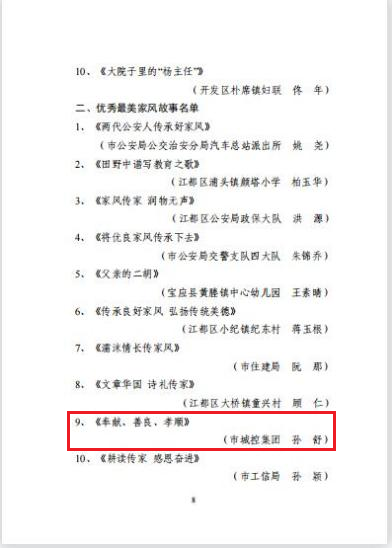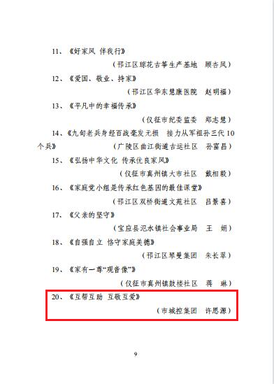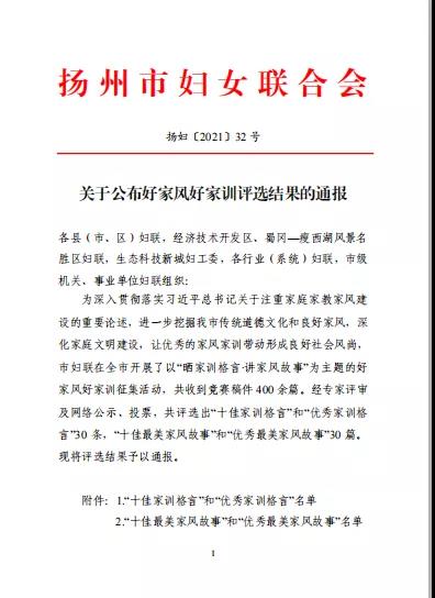 為進(jìn)一步傳承好家訓(xùn)、弘揚(yáng)好家風(fēng),傳播家庭向上向善的正能量,營(yíng)造良好的家庭氛圍,深入推進(jìn)家庭文明建設(shè),城控集團(tuán)行業(yè)婦聯(lián)積極響應(yīng)市婦聯(lián)開(kāi)展的“曬家訓(xùn)格言.講家風(fēng)故事”為主題的好家風(fēng)好家訓(xùn)征集活動(dòng),在集團(tuán)基層企業(yè)中進(jìn)行了廣泛發(fā)動(dòng),層層篩選,最終共選送了5條家訓(xùn)格言、5個(gè)家風(fēng)故事參評(píng)市婦聯(lián)活動(dòng)。經(jīng)專家評(píng)審和群眾投票評(píng)選,近日,揚(yáng)州市婦聯(lián)對(duì)優(yōu)秀作品進(jìn)行了通報(bào),集團(tuán)共有4個(gè)作品獲評(píng)“優(yōu)秀家訓(xùn)格言”、“優(yōu)秀最美家風(fēng)故事”。