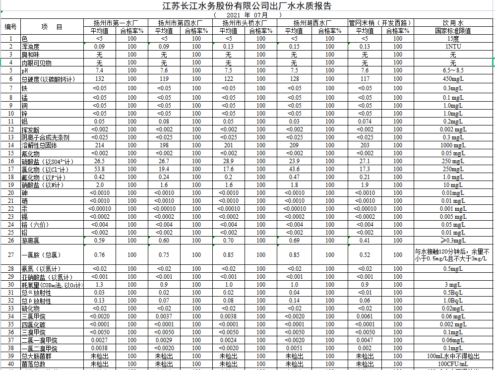 江蘇長江水務股份有限公司出廠水水質報告 (2021年07月)