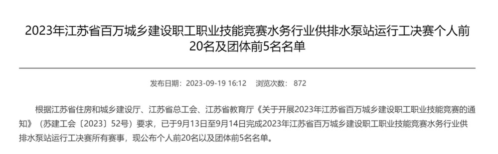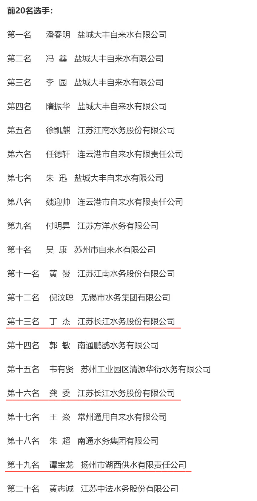 近日,江蘇省住房和城鄉(xiāng)建設(shè)廳公布了“2023年江蘇省百萬城鄉(xiāng)建設(shè)職工職業(yè)技能競(jìng)賽水務(wù)行業(yè)供排水泵站運(yùn)行工決賽”個(gè)人前20名及團(tuán)體前5名名單。長(zhǎng)江水務(wù)選手在全省近百名參賽選手的激烈角逐中表現(xiàn)出色、取得佳績(jī),丁杰、龔委、譚寶龍位列個(gè)人成績(jī)前20名,均榮獲“優(yōu)秀選手”稱號(hào),其他選手也正常發(fā)揮取得較好排名,揚(yáng)州代表隊(duì)榮獲團(tuán)體總分第5名。