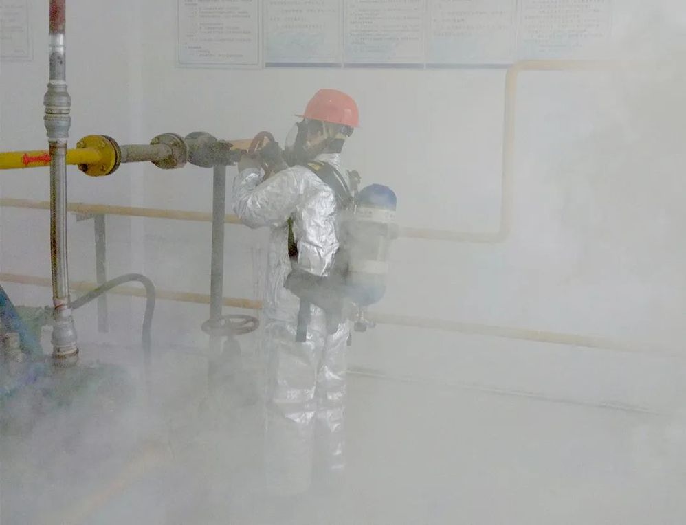 第二階段演練模擬壓縮機房發(fā)生泄漏。演練人員先切斷所有電源,關(guān)閉閥門,疏散無關(guān)人員。上報公司后,組織人員迅速穿戴防護服與正壓式呼吸器進入現(xiàn)場,在判定為法蘭連接處為泄漏點后,使用不發(fā)火工具,對泄漏部位進行搶修,再使用可燃氣體檢漏儀對泄漏點進行檢查,確保無泄漏。