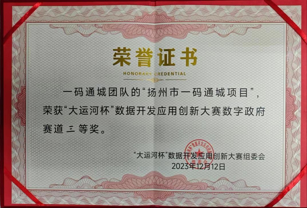 今年9月起,揚州市大數(shù)據(jù)管理局舉辦 “2023年‘大運河杯’數(shù)據(jù)開發(fā)應(yīng)用創(chuàng)新大賽”,由江蘇省大數(shù)據(jù)管理中心、江蘇大數(shù)據(jù)聯(lián)盟指導(dǎo),揚州市發(fā)改委、工信局聯(lián)合主辦。大賽主題為“江河融慧好地方 數(shù)聚賦能新發(fā)展”,設(shè)4個賽道,其中數(shù)字政府賽道設(shè)一等獎1名、二等獎3名、三等獎6名。大賽共吸引全國180支團(tuán)隊、396位數(shù)字人才報名,在12月12日決賽中,市民卡公司“揚州市一碼通城項目”榮獲“大運河杯”數(shù)據(jù)開發(fā)應(yīng)用創(chuàng)新大賽數(shù)字政府賽道三等獎。