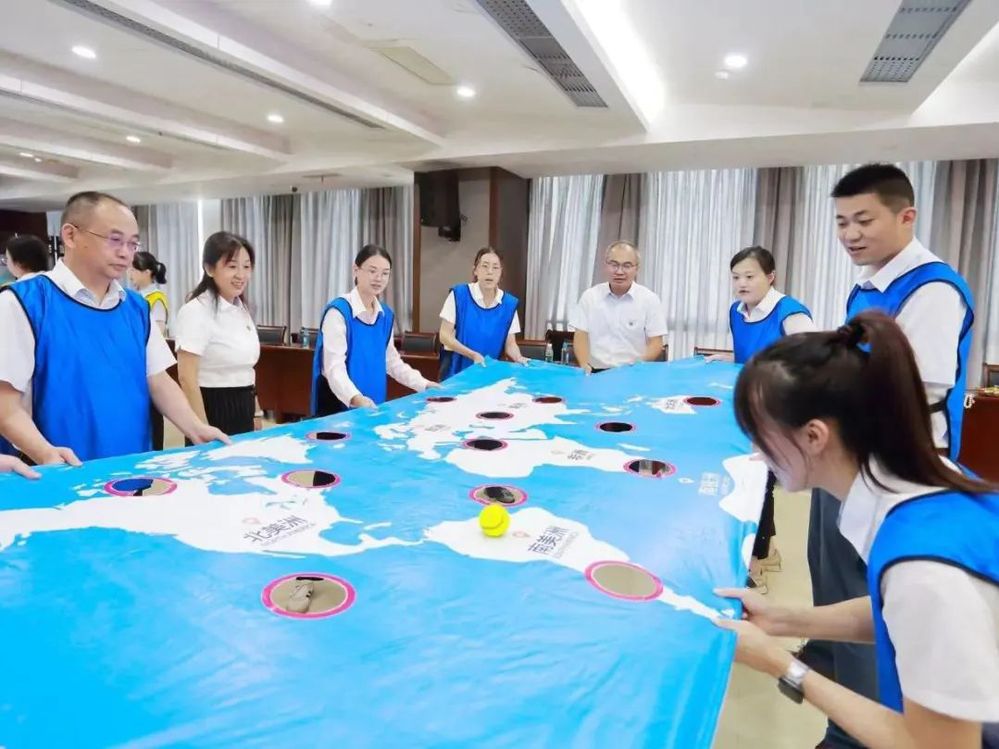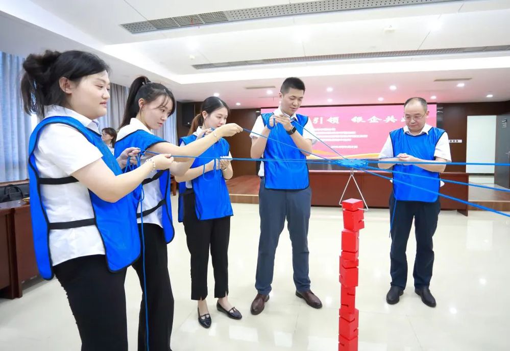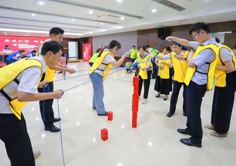 此次共建活動在歡快輕松的氛圍中進行,為充分調(diào)動大家的參與熱情,在主持人熱情地引導下,大家首先進行了熱身。熱身活動后,揚州中燃公司和三家銀行組建三支團隊依次開展“環(huán)游世界八十天”、“達芬奇密碼”、“聯(lián)合攻城”等一系列團隊協(xié)作競賽。大家在競賽互動中不斷磨合,增強了彼此之間的信任感和團隊凝聚力。“聯(lián)合攻城”作為競賽環(huán)節(jié)的最后一個項目,將現(xiàn)場的氣氛推到一個高潮?!奥?lián)合攻城”需要隊員們同時操控手中的繩子,利用三角形的鉤子,將現(xiàn)場的八塊積木堆積成一個柱子,堆積過程中手不可觸碰積木,且柱子不倒塌視為完成競賽,用時最少的隊伍獲勝。這項競賽既考驗了隊員們之間的團隊協(xié)作能力,又考驗了每一位隊員的心理素質(zhì)和應對能力,大家在團結(jié)緊張活潑的氣氛中感受著充滿挑戰(zhàn)競賽過程和完成項目的喜悅。