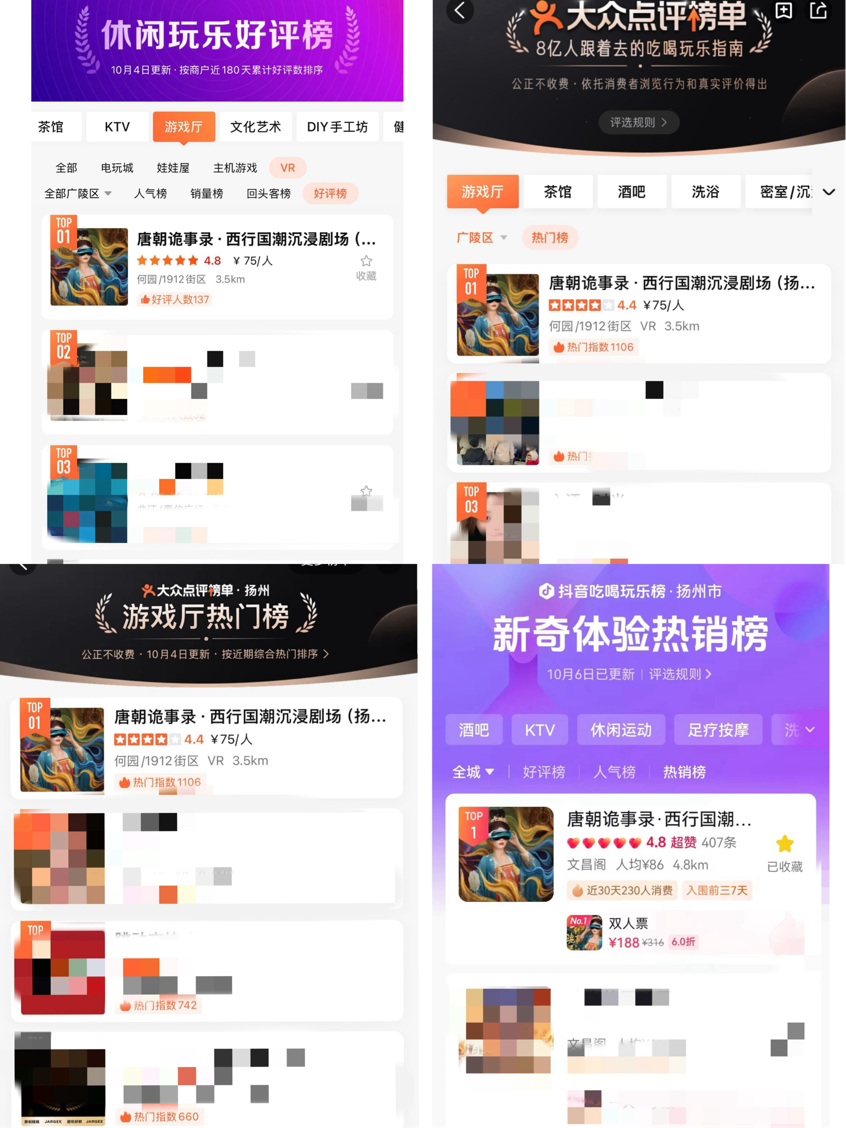 秋澄萬景麗,舉國同歡慶。這個國慶假期,揚(yáng)州城控集團(tuán)《唐朝詭事錄·西行》國潮沉浸式劇場迎來了開業(yè)后的首個旅游熱潮,大眾點(diǎn)評、美團(tuán)多榜封頂,穩(wěn)居Top1,好評如潮;抖音、小紅書、美團(tuán)、點(diǎn)評等推廣平臺相關(guān)話題、短視頻等曝光量超500w,揚(yáng)州文旅、揚(yáng)州發(fā)布等官方媒體相繼對唐詭的熱潮進(jìn)行了宣傳報道,成為國慶黃金周揚(yáng)州文旅市場一大亮點(diǎn)。