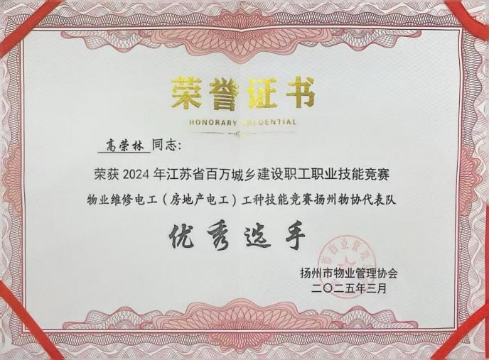 維修電工(房地產(chǎn)電工)工種技能競賽“優(yōu)秀選手 ”,高榮林同志,憑借出色的工作技能,在省級競賽“江蘇省百萬城鄉(xiāng)建設(shè)職工職業(yè)技能競賽物業(yè)維修電工(房地產(chǎn)電工)工種技能競賽”中榮獲“優(yōu)秀選手 ”稱號。這一榮譽稱號,不僅是對該名員工個人能力的認(rèn)可,更是對城建物業(yè)在員工培養(yǎng)與團隊建設(shè)方面的肯定。
