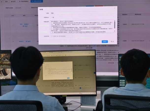 該環(huán)節(jié)為線上演練,模擬揚州市氣象臺發(fā)布暴雨橙色預(yù)警,市防汛指揮部啟動Ⅲ級應(yīng)急響應(yīng)。收到預(yù)警信息后,公司防汛總調(diào)度部門通過“城排通”系統(tǒng)發(fā)布雨前預(yù)警通知,提醒生產(chǎn)部門雨前需準備工作,包括污水設(shè)施巡查、設(shè)備維保、物資保障、應(yīng)急值守等內(nèi)容。公司防汛排澇總調(diào)度根據(jù)雨情及時啟動一級應(yīng)急響應(yīng),各生產(chǎn)部門按照指令立即部署各項工作,并通過手機APP端將現(xiàn)場情況實時上傳至“城排通”系統(tǒng)防汛平臺。