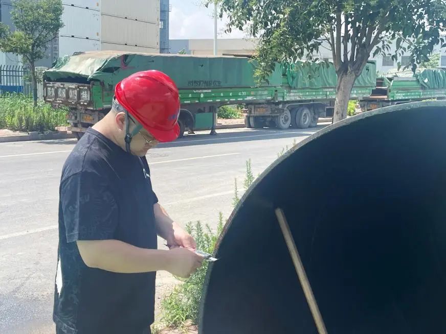 惡劣天氣,尤其是陰雨連綿,是對材料驗收更嚴峻的考驗。為防止水穩(wěn)和基層被雨水浸濕,顧濤一邊要求工人加快攤鋪速度,一邊俯身檢查水穩(wěn)層是否有松散跡象。雨水濕衣,泥濘滿褲,他仍堅持在泥水里仔細核對,檢查到場管材是否存在裂縫、破損。無論是深夜的困倦,還是惡劣的環(huán)境,都無法動搖他堅守的責任心,他用日復一日的“零容忍”的嚴謹態(tài)度、“隨時待命”的敬業(yè)精神,守護著每一批材料的品質(zhì),為市政道路建設(shè)的雨污水暢通和景觀煥新筑牢根基。