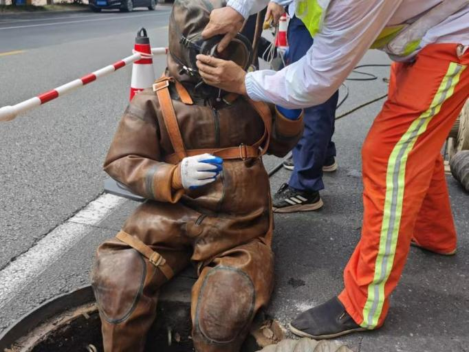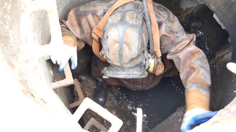 對于井室和管道內(nèi)存在的大塊水泥和混凝土,常規(guī)方法難以清除,只能通過人工下井清掏。穿上厚重的防護服、戴上防毒面具、系好安全繩,相榮慢慢降入井中。管道內(nèi)悶熱潮濕、空氣混濁?!熬聹囟缺鹊孛孢€高,像蒸桑拿?!痹谥睆絻H700mm的井室內(nèi),相榮用風(fēng)鎬將水泥塊打碎,并用小桶將打碎的水泥碎塊裝進去,再由井上面的輔助人員一桶一桶的拎上來,并及時裝入垃圾袋,當(dāng)天集中清運。經(jīng)過兩個小時的奮戰(zhàn),他們終于疏通了這段兩米多長的堵塞管道。當(dāng)相榮被上面兩個輔助人員通過三腳架及安全繩拉上來時,汗水濕透了他的衣服。
