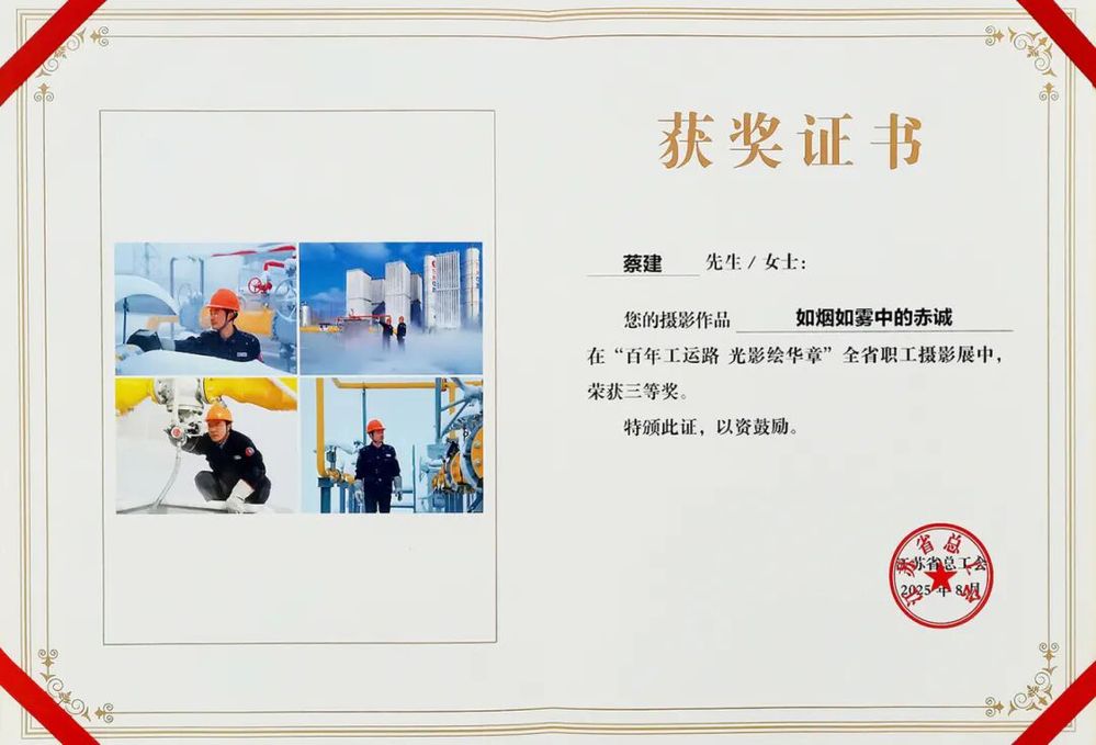 近日,江蘇省總工會(huì)主辦的“百年工運(yùn)路 光影繪華章”全省職工攝影展公布獲獎(jiǎng)情況,揚(yáng)州中燃公司黨群工作部蔡建的攝影組圖作品《如煙如霧中的赤誠(chéng)》榮獲三等獎(jiǎng)。