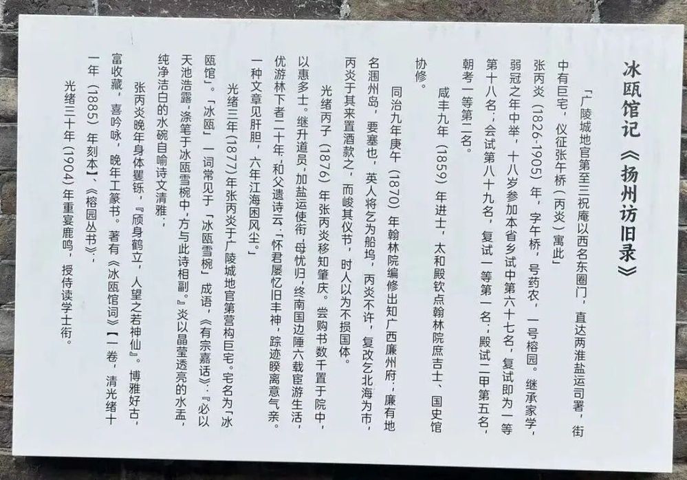 張丙炎的一生,橫跨晚清政治變革與文化轉(zhuǎn)型。他在嶺南的政績、對包世臣學(xué)術(shù)的承襲、對鄉(xiāng)邦文獻的守護,以及冰甌館的營建,共同構(gòu)建起一個士大夫的文化樣本。其故居經(jīng)修繕后獲評揚州市文物保護單位,更以“民宿+文化空間”模式,成為傳統(tǒng)建筑活化利用的典范。